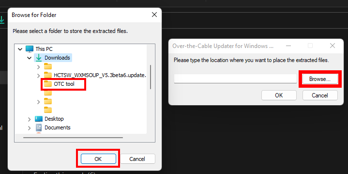 Select Browse, select the OTC Tool folder in your Downloads Folder. Push OK and then OK again.