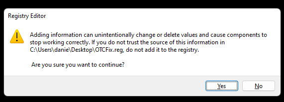 Next, Download and run the OCTFix.reg from above. Select YES when prompted if you want to implement the values.