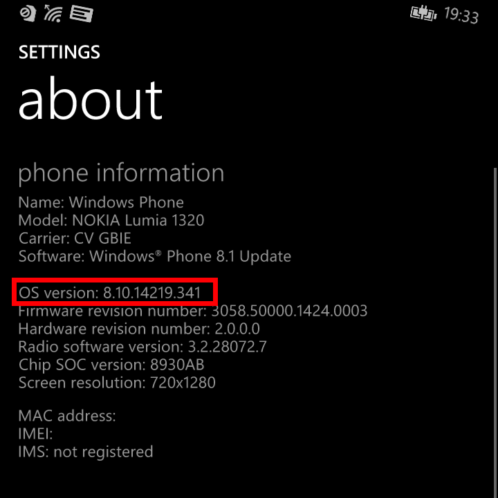 Next, head back to Settings > About and validate that you're now running 8.10.14219.341 or newer. If you're not, launch Windows Device Recovery Tool (which you installed earlier) and see if that has an update available. If it does, install it and then follow this procedure again.